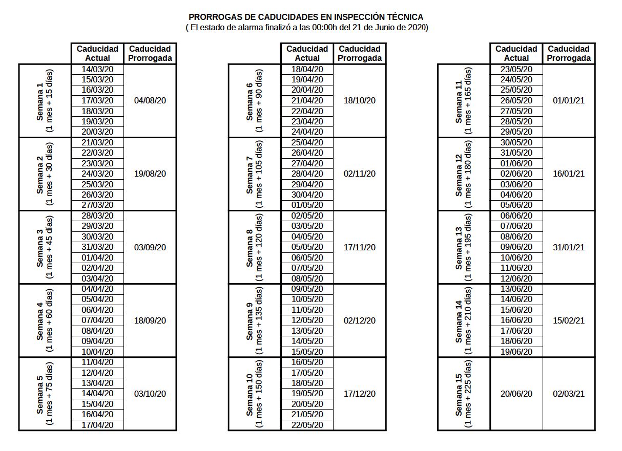 Te recordamos que los plazos de validez de la inspección técnica de los vehículos que vencieron durante el estado de alarma han sido prorrogados. Puedes calcular la prórroga de tu vehículo usando nuestra "Calculadora de Prórrogas" o consultarlo directamente en la siguiente tabla.